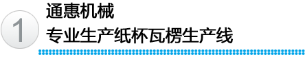 江陰市通惠機械有限公司,專業生產紙杯瓦楞生產線,研發的中空紙杯專用瓦楞杯生產線,S楞、菱形、圓形、點狀形瓦楞紙杯專用生產線。同時,還生產單面瓦楞紙板生產線。